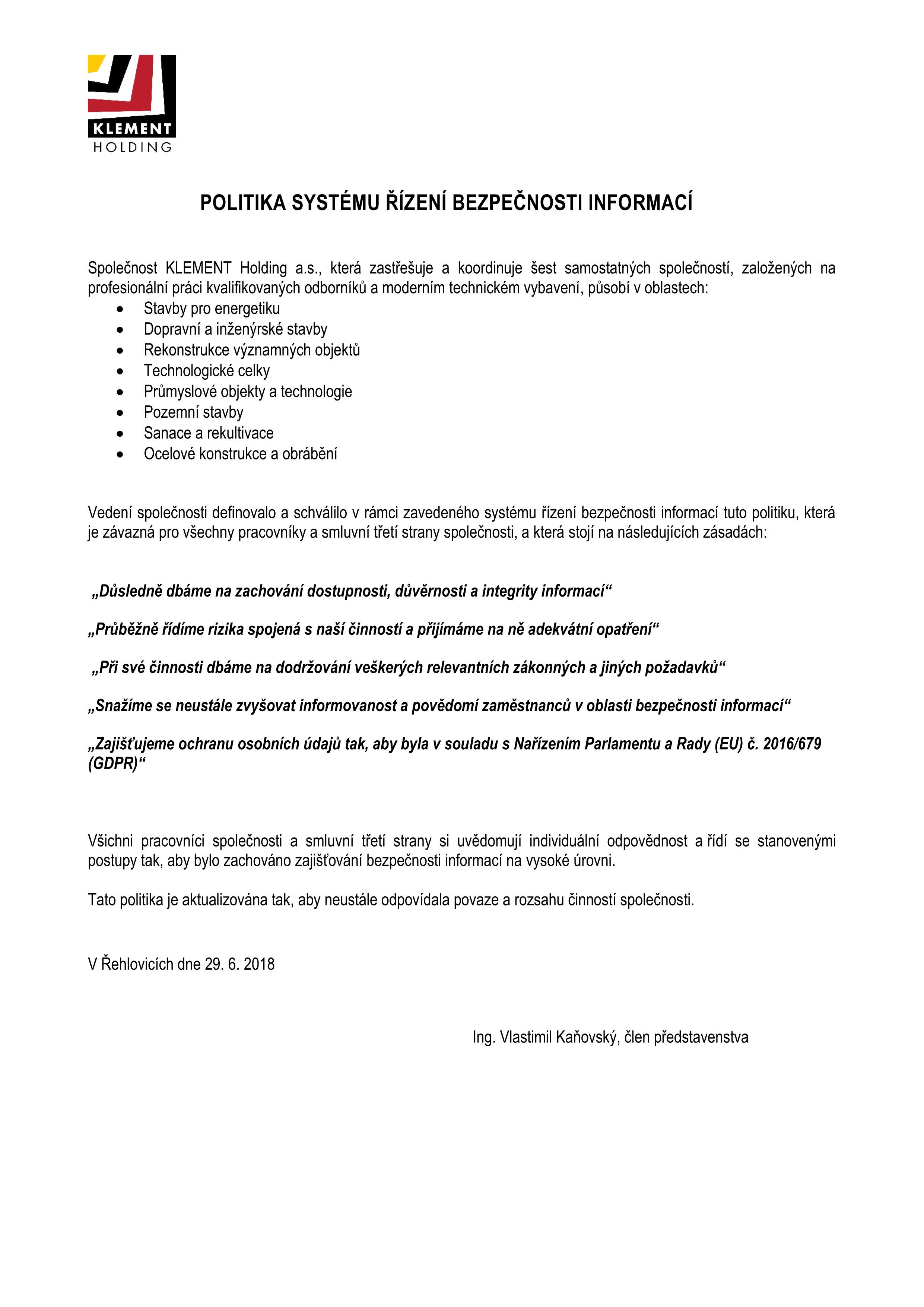 KLEMENT Holding zastřešuje a koordinuje šest samostatných společností, založených na profesionální práci kvalifikovaných odborníků a moderním technickém vybavení. Každá ze společností v rámci holdingového uspořádání plní specifickou roli a specializované týmy odborníků se profesionálně a výhradně věnují každému projektu ze segmentu svého působení v oblastech stavební a strojírenské výroby.